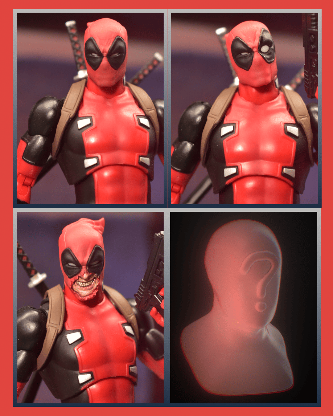 - Comes with 3 different alternate Deadpool custom Headsculpts designs